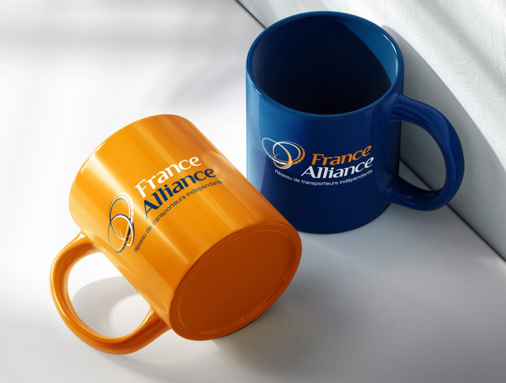 Cohérence de la charte graphique avec une déclinaison personnalisée sur différents supports de communication, idéal pour les cadeaux d’entreprise : impression sérigraphiée sur textile, polos ou doudounes, gobelets, gourde, mug, divers objets publicitaires.