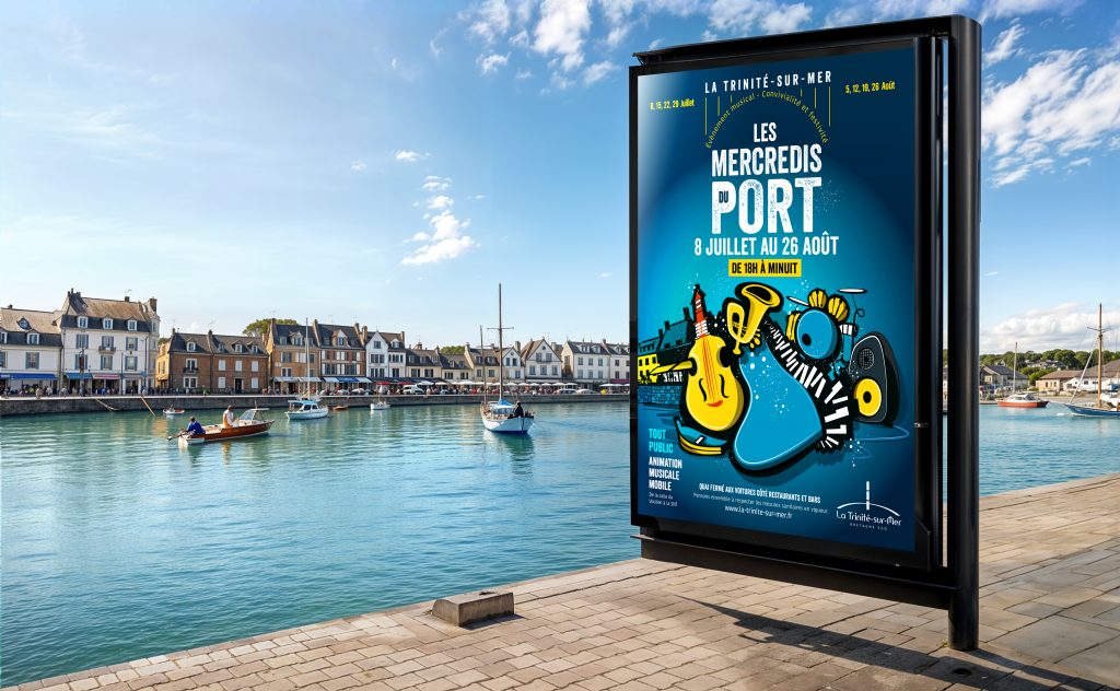 Photomontage d'une affiche abribus pour "Les Mercredis du Port" à La Trinité-sur-Mer, mettant en avant une communication festive et attrayante, avec des visuels dynamiques et un design captivant.